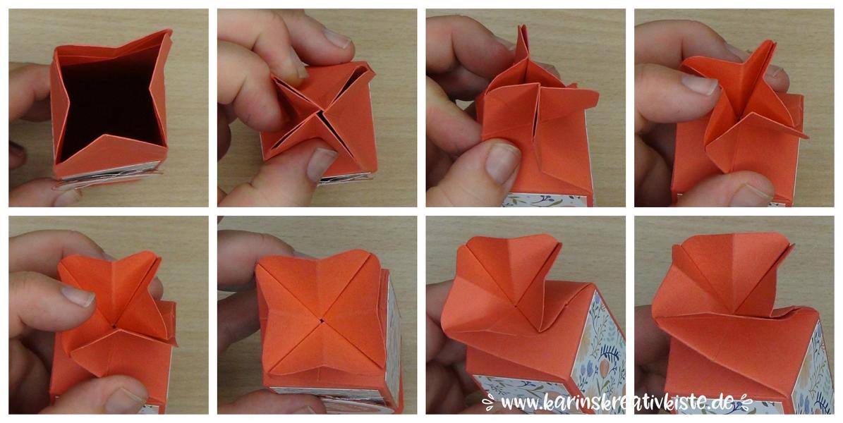 Tipp: Das Verschließen der Box ist etwas tricky. Folge dabei leicht drehend in Richtung der schrägen Falzlinien, um die Enden der Box „aufzublättern“